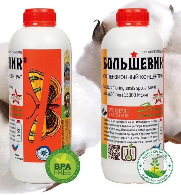 Биологический инсектицид «Большевик» (суспензионный концентрат) Действующее вещество Bacillus thuringiensis* spp. aizawai — продуцент инсектицидного дельта‑эндотоксина (из группы микробных организмов). Состав - спорово‑кристаллический комплекс бактерий (споры и природные токсины) — 60 % (600 г/кг), титр $5 \times 10^8$ КОЕ/г; -остатки питательной среды и метаболитов; - адъювант; - органический гуминовый консервант. Особенности - не содержит ГМО — подходит для органического сельского хозяйства; - соответствует ГОСТ 33980‑2016 и Положению Совета ЕС № 834/2007. Норма применения 1–3 кг биопрепарата на 1 га. Способ применения 1. Приготовить свежеприготовленный водный раствор из расчёта 200 л на 1 га. 2. Опрыскивать растения в утренние или вечерние часы. 3. Проводить обработку в сухую погоду при скорости ветра не более 4 м/с. 4. Соблюдать оптимальную температуру применения: +18…+32 °C. Ключевые моменты обработки Опрыскивание проводить в период массового отрождения личинок каждого поколения вредителя и их активного питания. Кратность обработок: 1–3 раза (зависит от роста культуры, активности насекомых, погодных условий и других факторов). Повторные обработки — с интервалами 3, 7 или 14 дней. Препарат можно применять в любой период роста растений. Назначение Защита растений от вредителей за счёт действия природных токсинов и спор бактерий. Преимущества и безопасность безопасен для пчёл и других полезных насекомых; эффективен против широкого спектра вредителей (особенно на ранних стадиях их развития).